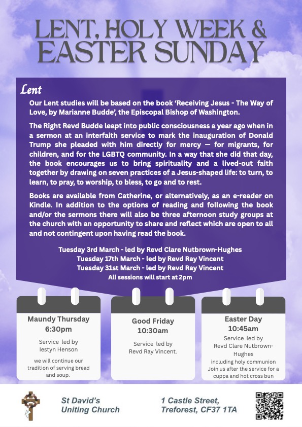 Saint David’s Uniting Church  Castle Street, Treforest CF37 1TA     Minister Elect: Ordination on Saturday!!        Church Telephone No:  07766892487            Website: www.stdavidsuniting.org.uk                   Admin email: [email protected]     Link for Live Stream – https://www.youtube.com/channel/UC1ftWuXHexnfFdo1FKwXBZA  24h Aug 2025 We welcome you all to our services today, especially if you are a visitor or […]